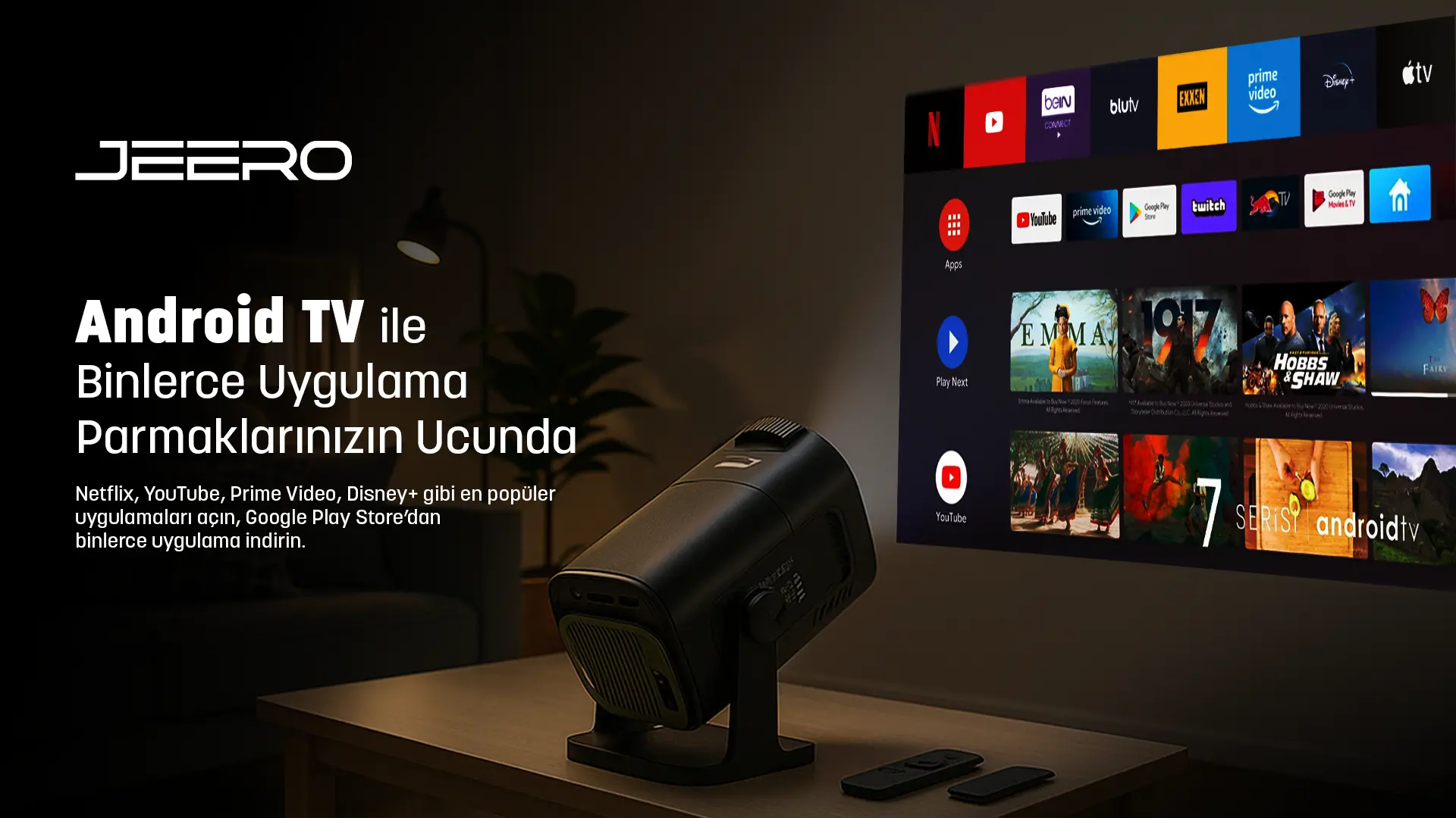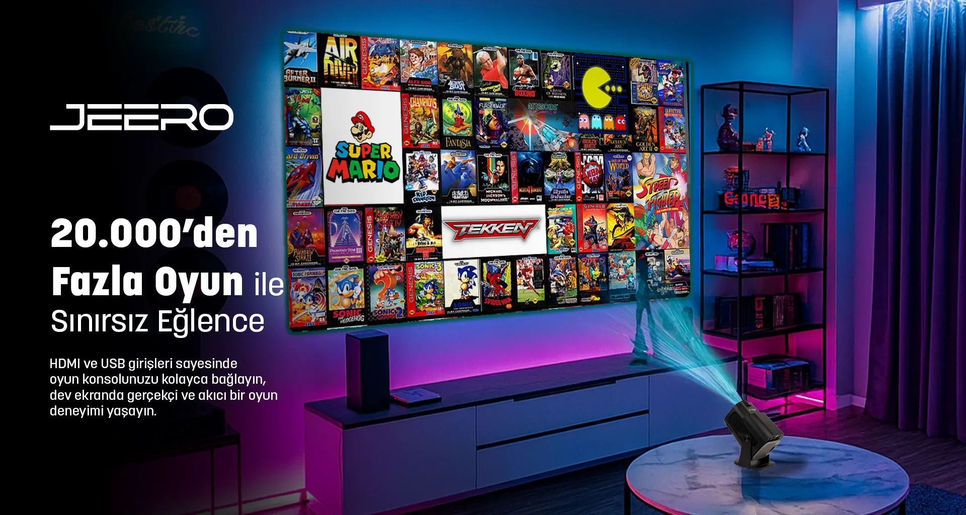 Jeero Android oyunlu projeksiyon, tek bir cihazda hem projeksiyon hem de oyun konsolu deneyimi sunarak film, dizi ve oyun keyfini evinizde bir araya getirir.